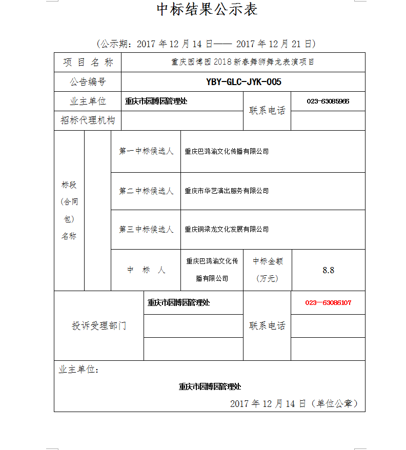重庆园博园2018新春舞狮舞龙表演项目中标结果公示表