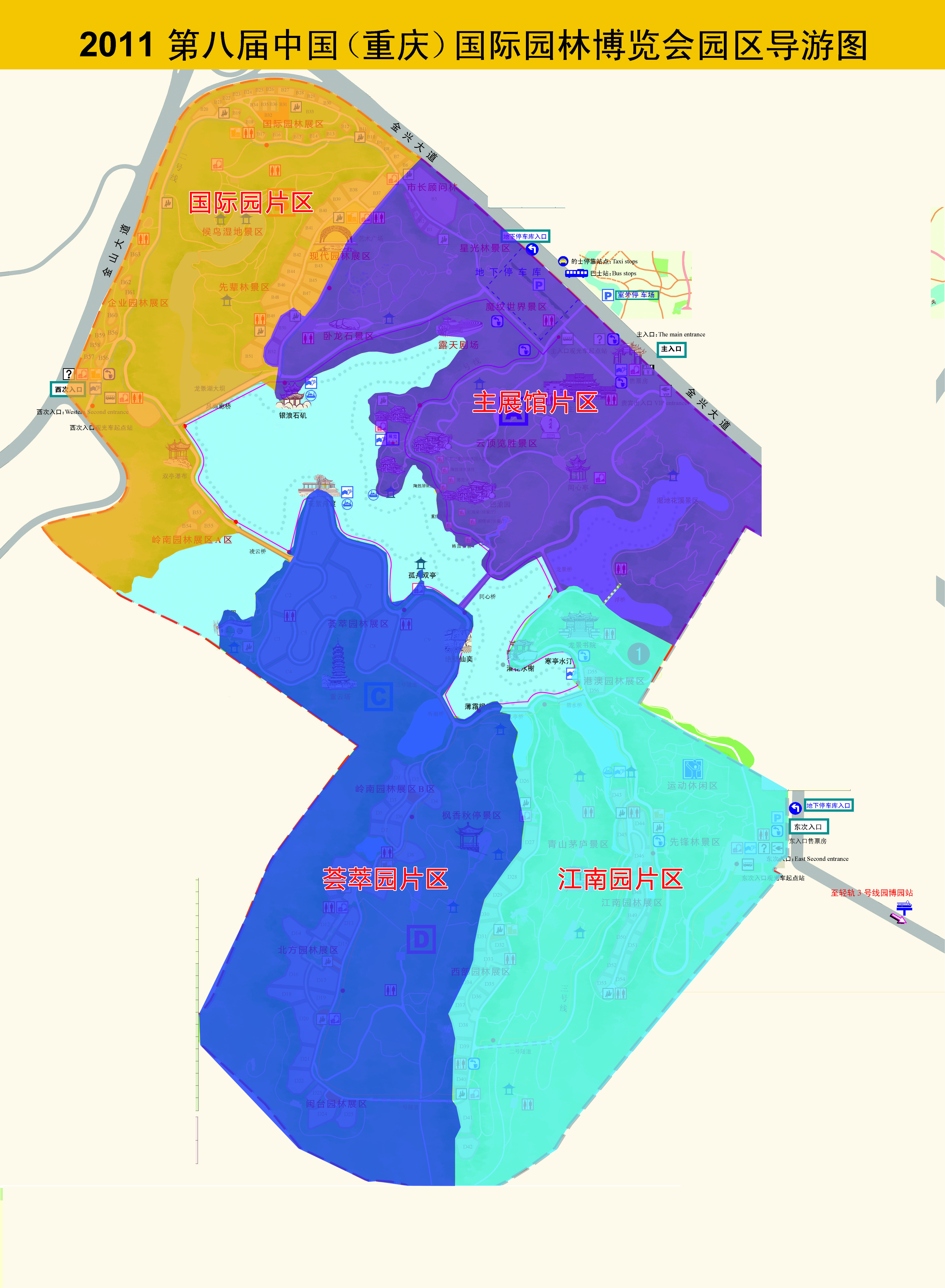 江南园片区:青山茅庐景区─西部展园─江南展园─东门─龙景书院─港澳园。详见后附区域划分图。