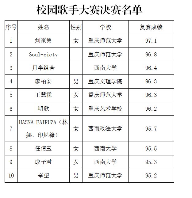根据重庆园博园“园博之星”校园歌手大赛的赛程规则,经评委综合评定,恭喜以下10名选手晋级总决赛(详细名单附后)。决赛时间安排为2018年5月1日(星期二),上午9:30开始签到(主展馆一楼多功能厅)、抽签、试台、调音、化妆等工作,下午13:30比赛正式开始,请选手务必准时参加。另,伴奏由选手自备,要求每人准备两首质量清晰、无消音版、无原唱声、格式为mp3的歌曲。