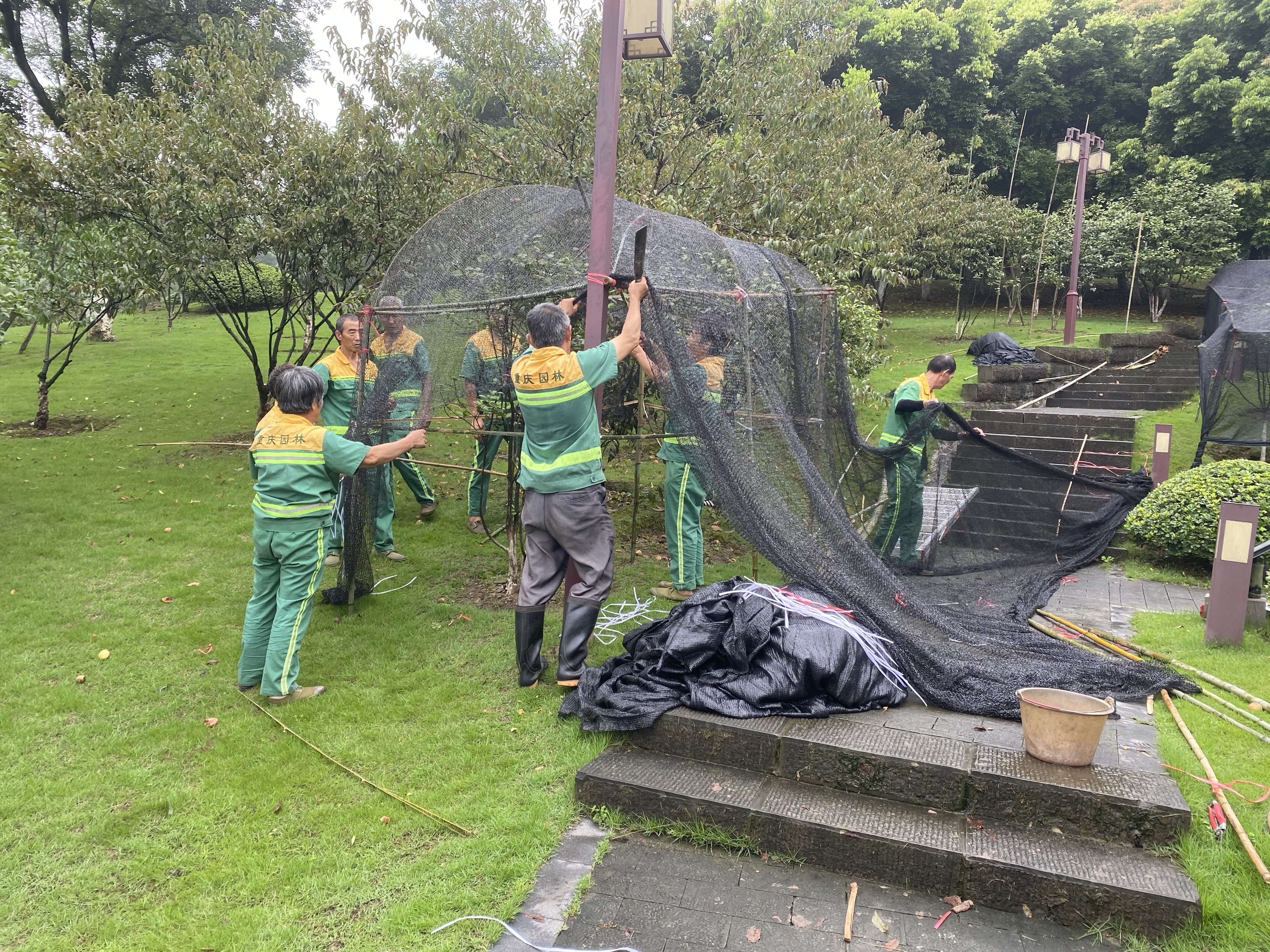 一是要求所有植物管护人员暂停休假,保障抗旱期间人力充足。二是积极协助水电工人检查并及时维修管网和水泵,随时解决抗旱供水出现的问题。三是调整管护工人上下班时间。上午上班时间调整为凌晨3点到上午11点,下午上班时间调整为18点以后。工人轮班分时段、分区域浇水,既保证园区整体抗旱需求,又通过错时浇水避免部分片区水压小或无水的情况。四是安排管护企业组织水车对水压不足的区域进行浇水,弥补给水管网供水不足的问题,确保山顶区域植物抗旱。五是采用水袋滴灌的方式确保大树生长。对重要景观树、大树和山坡区域的大乔木,采取水袋滴灌的方式进行植物浇灌,保证大树安全度夏,有效地缓解大树缺水的问题。六是对园区内桂花、杜鹃、牡丹等植物搭设遮阳网,避免阳光直射灼伤叶片。七是在边坡区域安装临时滴灌软管。对坡度较大的区域,采取临时安装滴水软管,通过漫灌的方式对边坡绿化进行浇水,确保边坡植物的正常生长以及原生态保留区植物供水。八是对土壤板结的区域和大树及时采取松土、打孔等措施,保障浇水效果。九是全体管理人员加强巡查,分时段检查各片区浇水情况,发现问题第一时间处理。同时,为保障一线养护工人的作业安全,还要求各养护单位发放防暑降温药品,并做好夏季防暑、用电安全工作,夜间浇水配备必要的照明设备等。