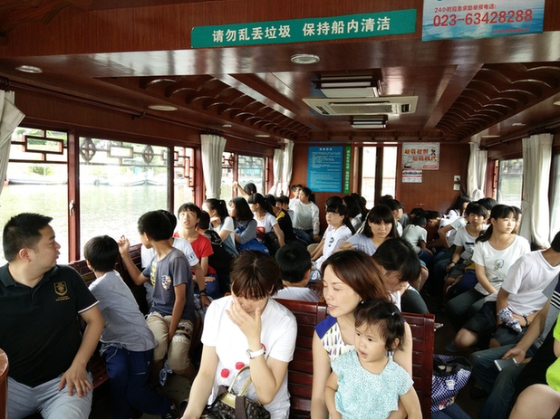 结束传统文化活动后,科普使者带领孤儿们从江南园码头上船,带领孩子们感受画舫船、水上畅游园博园,沿途介绍了巴渝吊脚楼、北京园画中游景点、凌云桥等特色景点的来历和典故,孩子们说“这是他们第一次坐这么美的船”,满脸的幸福。
