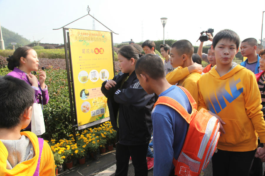 活动中,重庆园博园的科普使者陪同孩子们边赏菊,边讲解菊花科普知识,从菊花名称的由来、菊花花瓣及分类、菊花叶片特色及品种辨别到菊花诗词文化,进行科普讲解,让这些儿童收获知识,沐浴温暖。