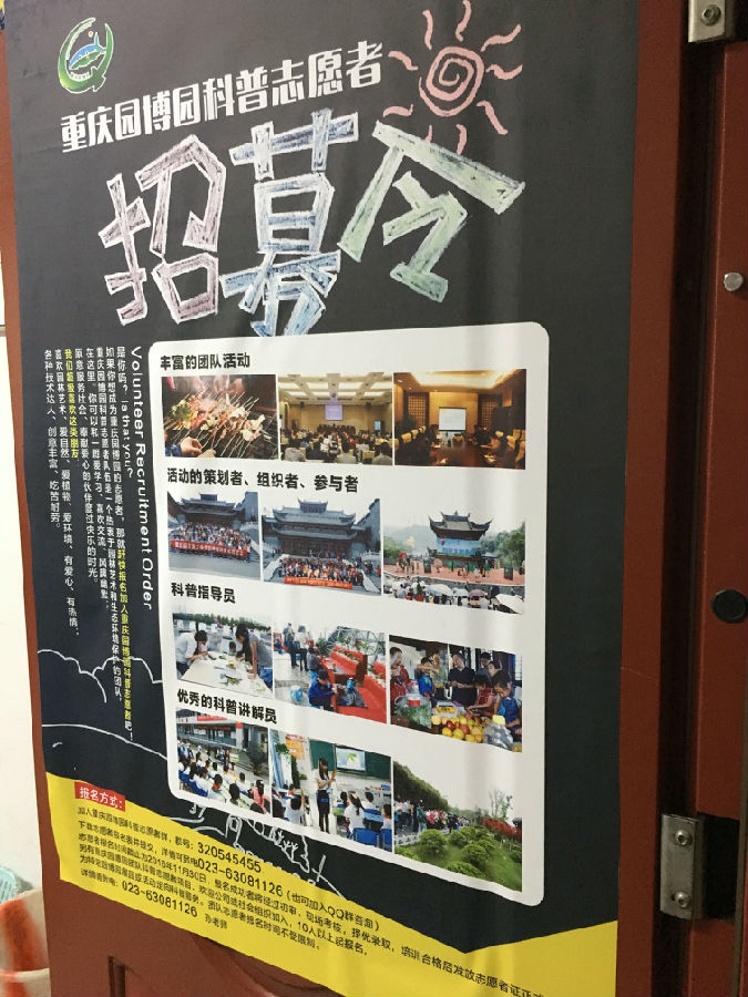 2016年11月20日,重庆园博园首批科普志愿者招募启动仪式在西南大学园艺园林学院405教室举行,150余名大学生参加宣讲会并积极填写报名表,希望成为一名科普志愿者。