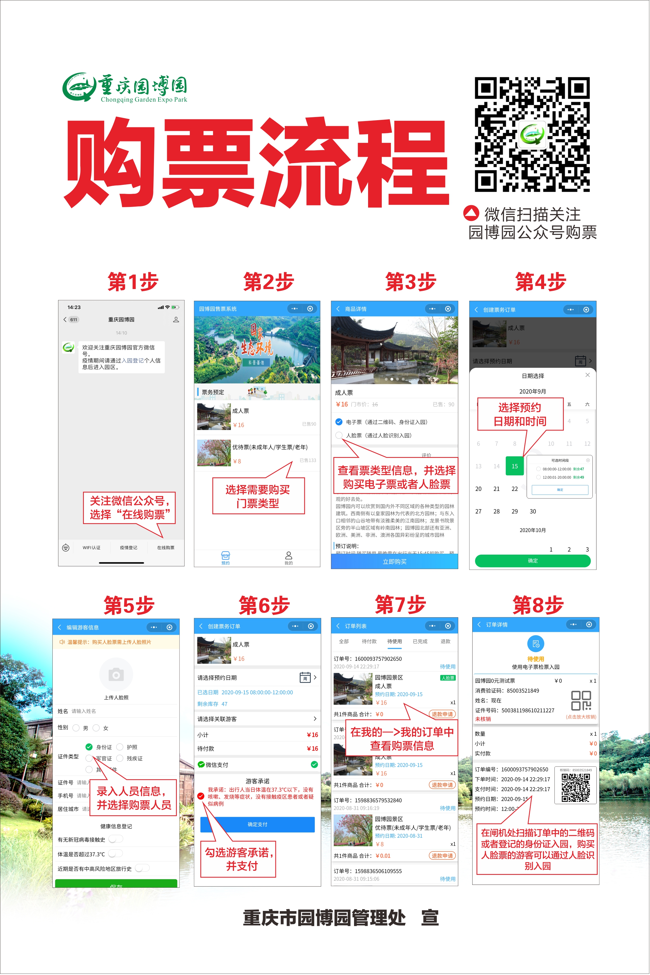 为着力落实《“十三五”旅游业发展规划》,加快推进园林公园数字化、智慧化建设,提高公园管理和公共服务智慧化水平,使公园在旅游产业结构得到有效、合理的优化,重庆园博园从即日起取消纸质票销售,全面实行线上售票、预约入园。游客可登录重庆园博园微信公众号进行预约、购票(免票人群同样须在线上完成预约),购票或预约成功后凭身份证或订单二维码或人脸识别检票进园。感谢各位游客的理解和配合,祝游园愉快!
