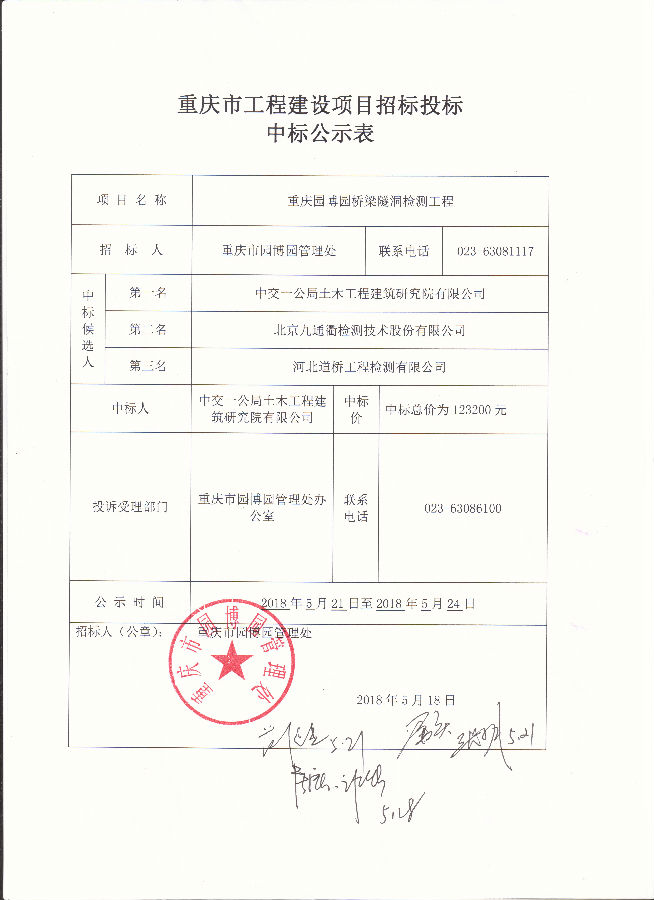 重庆园博园桥梁隧道检测工程项目中标公示表