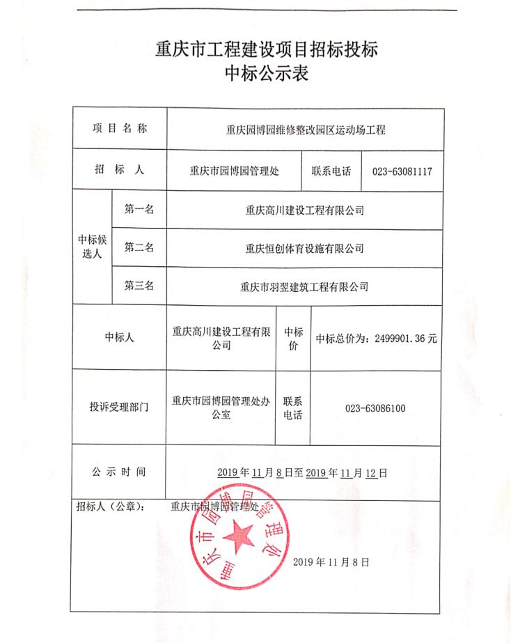 重庆园博园维修整改园区运动场工程中标公示表