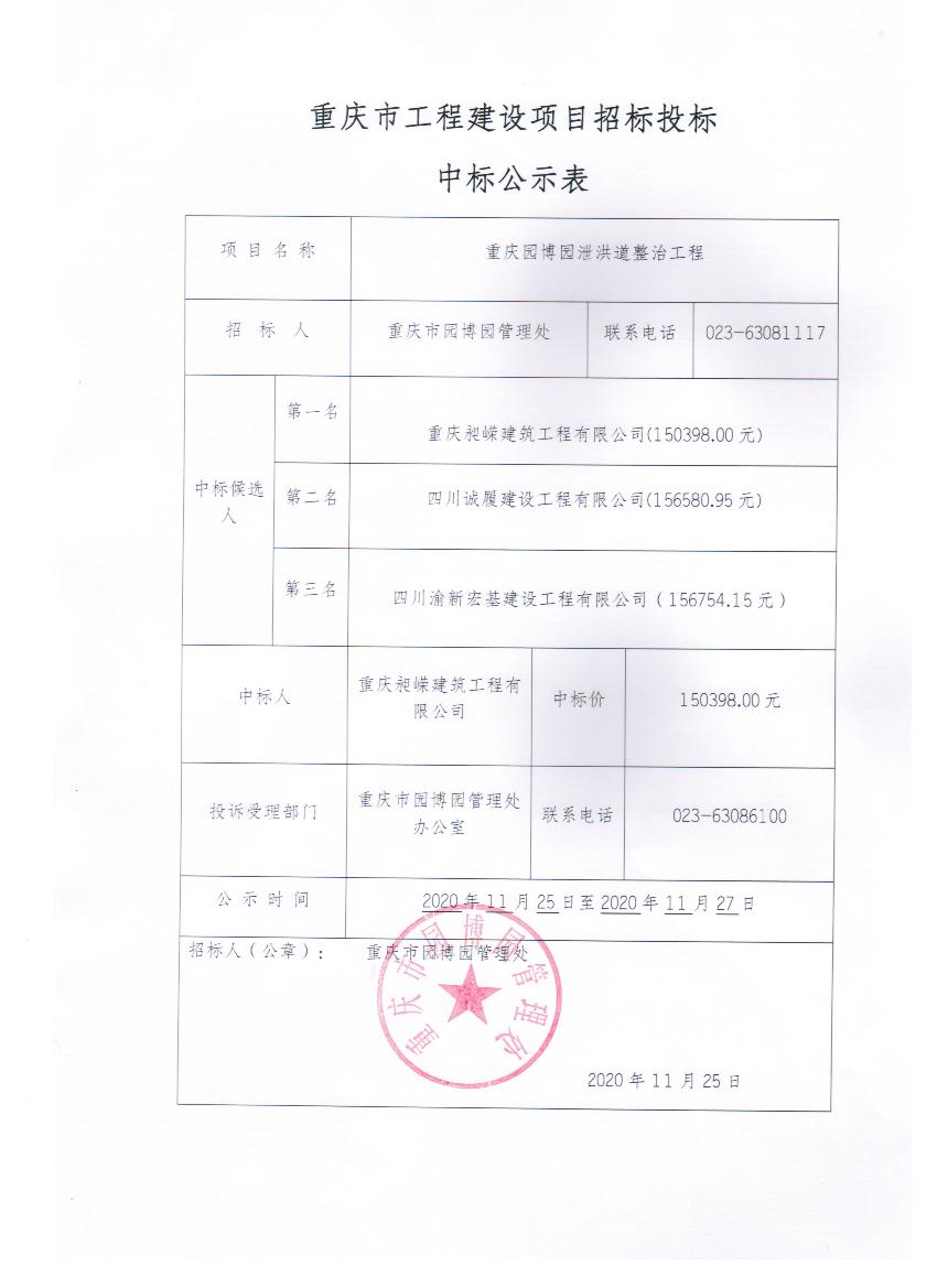 重庆园博园泄洪道整改工程中标公示表